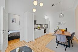 For a rental period of less than 6 months, VAT of 7% will be charged on the total rental price. The newly renovated apartment impresses with its radiant, modern interior and offers a particularly cozy living experience thanks to its high-quality furnishings. A comfortable king-size box-spring bed for 2 people awaits you in the separate bedroom. The living space is characterized by a particularly open window front, so that you get excellent lighting conditions throughout the apartment. In addition to the comfortable sofa, the apartment has a state-of-the-art smart TV with Netflix and Amazon Prime functionality, a Sonos sound system and free WiFi internet access with a flat rate. The new brand-name kitchen with dishwasher, microwave and all the necessary cooking utensils leaves nothing to be desired. In the center of the kitchen area we have the table, which allows up to 4 people to linger. The apartment also has a separate desk so that you can focus on your home office activities from here. The new bathroom is equipped with a rain shower and a washing machine with dryer functionality. Equipment features: Furnishing and equipment by professional interior designers Box spring beds (premium hotel level) Fully equipped, modern kitchen with dishes, pots, bowls, kitchen utensils, etc. Refrigerator with freezer compartment Oven and microwave Modern ceramic hob Dishwasher Nespresso coffee machine, toaster & kettle High-quality towels & bed linen Vacuum cleaner, iron, ironing board, clothes horse, cleaning utensils, hairdryer, free internet, smart TV (with Netflix and Amazon Prime function), Sonos sound system